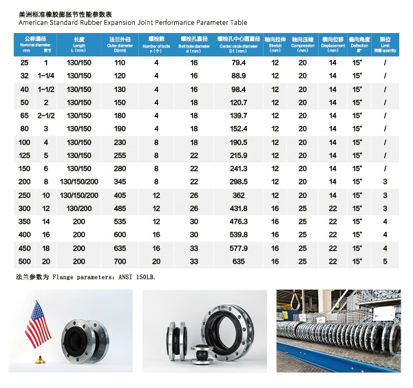 上海淞江减震器集团有限公司网站为您介绍:【ANSI】DN100美标橡胶膨胀节信息,淞江集团为众多客户提供美标型橡胶管接头产品,主要采用美标150LB法兰标准,橡胶采用长度130mm标准,具有良好的减震和降噪效果。